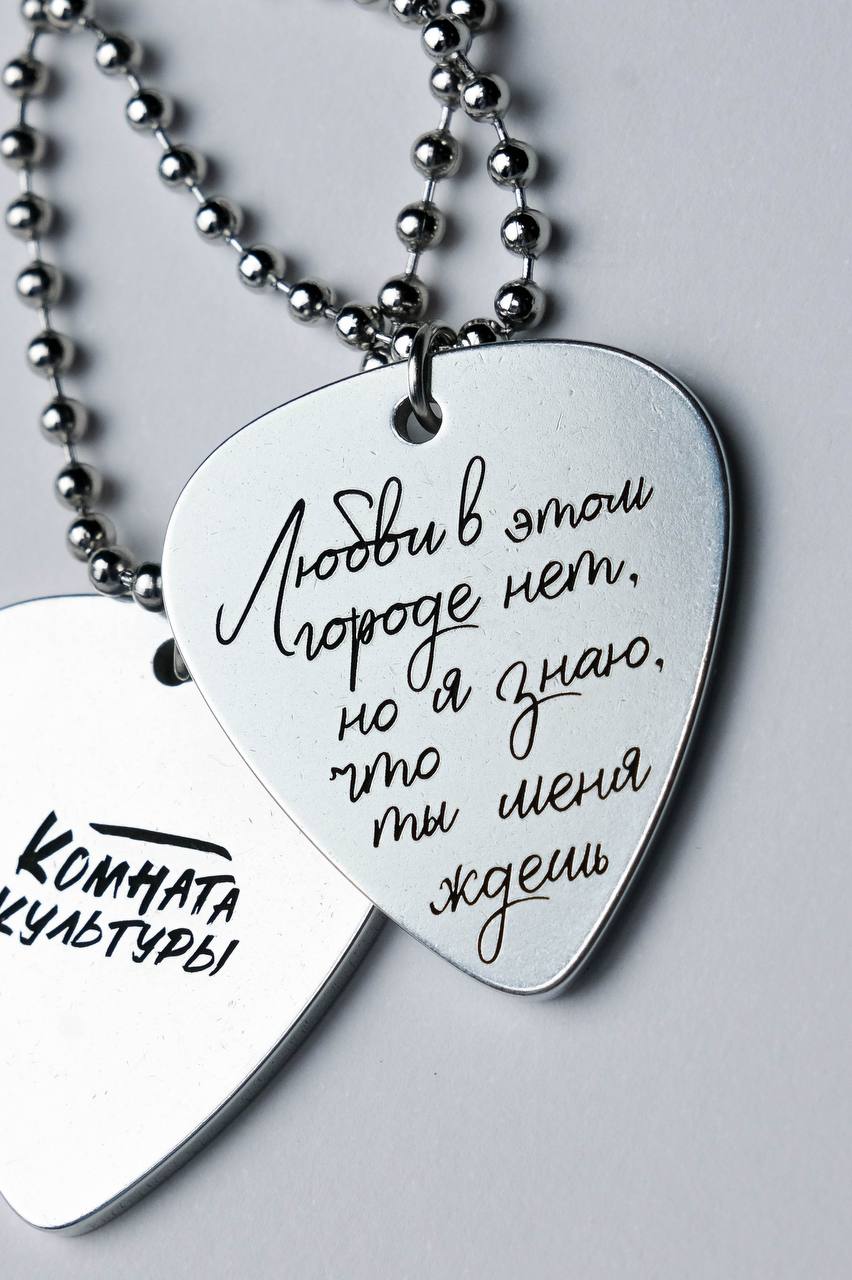 Это подвеска от KkStore из серии аксессуаров и украшений, вдохновлённых творчеством и смыслами Комнаты Культуры. Это украшение — не просто аксессуар, а маленький арт-объект, который может стать твоим талисманом, напоминанием о любимых песнях.